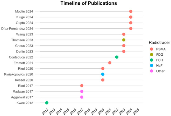 Timeline of publications and radiotracers used. Included studies are plotted by year of publication along the vertical axis. The color-coded dots indicate the primary PET radiotracer employed in each study: PSMA-based (red), FDG (olive), FCH (green), NaF (blue), and other tracers (magenta). This timeline highlights the recent predominance of PSMA-targeted PET imaging in PCa research and its integration with liquid biopsy methodologies.