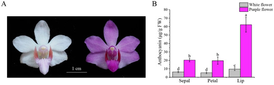Phenotypic comparison and anthocyanin content of white and purple flower P. pulcherrima cultivars. (A) Photographs of white and purple flowers. (B) Comparison of total anthocyanin content of sepals, petals, and labellum between white and purple flower varieties. Letters above bars indicate significant differences at p < 0.05. The data show the means of three biological replicates ± SD.