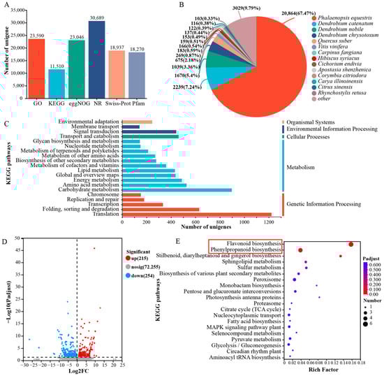 A sequence similarity analysis was performed using the BLASTX algorithm, comparing our protein sequences to those in multiple public repositories, with an E-value threshold established at 1 × 10−10. These genes underwent BLAST (https://www.ncbi.nlm.nih.gov/) searches in six public databases to infer their functional roles. The results revealed that 31,300 unigenes (43.04%) were successfully mapped to at least one of the six public databases (Figure 2A). In the NR database, 14 top-hit species derived from NR annotations were identified, with P. equestris exhibiting the highest similarity score to Dendrobium officinale (67.47%), followed by Dendrobium catenatum (7.24%), Dendrobium nobile (5.4%), and Dendrobium chrysotoxum (3.36%) (Figure 2B). KEGG pathway enrichment analysis revealed translation, carbohydrate metabolism, and folding, sorting, and degradation as the predominantly represented pathways (Figure 2C).