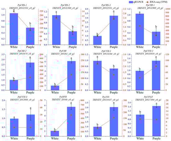 qRT-PCR validation of the expression profiles of selected unigenes related to anthocyanin biosynthesis. Twelve unigenes from this pathway were used to confirm the RNA-seq results. Expression levels were determined using the 2−ΔΔCT method. The left y-axis shows the relative expression of the unigenes by qRT-PCR, while the right y-axis displays the TPM values from the RNA-seq data. Letters above bars indicate significant differences at p < 0.05. The data represent the mean of three biological replicates, with ±SD.
