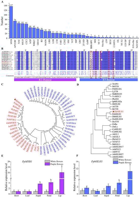 Phylogenetic analysis and relative expression level of PpMYB1 and PpbHLH1. (A) Distribution of the number of transcription factor gene families in P. pulcherrima. (B) Comparison of the protein sequence of PpMYB1 with its homologs from various species. The dashed red box indicates the interaction motif [D/E]LX2[R/K]X3LX6LX3R. (C,D) Phylogenetic analysis of PpMYB1 (C) and PpbHLH1 (D) compared to selected transcription factors from other plant species using the Neighbor-Joining method. (E) PpMYB1 and (F) PpbHLH1 expression levels in the root, leaf, sepal, petal, and lip of white and purple flower P. pulcherrima cultivars were measured using qRT-PCR. The data are means ± SD (n = 3). Letters indicate significant differences (p < 0.05, Duncan’s multiple range tests).