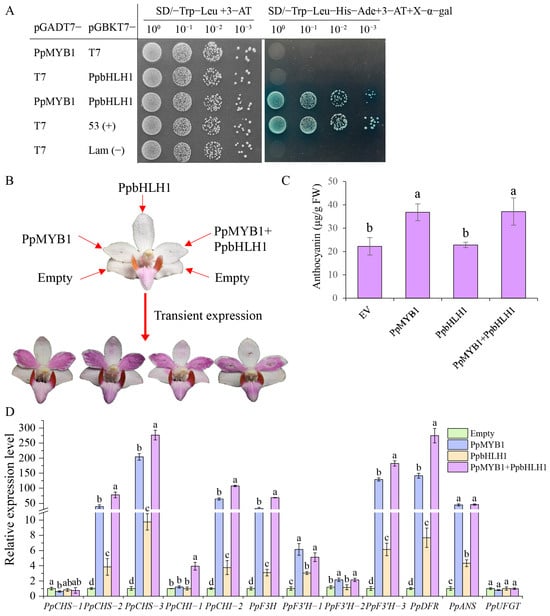 Detection of the interaction between PpMYB1 and PpbHLH1 and their transient overexpression in P. pulcherrima flowers. (A) The interaction between PpMYB1 and PpbHLH1 was analyzed using the Y2H system. The pGBKT7-Lam and pGADT7-T7 vectors served as negative controls, while the pGBKT7-53 and pGADT7-T7 vectors functioned as positive controls. (B) Photographs of the phenotypes from transient expression experiments of PpMYB1 and PpbHLH1 in P. pulcherrima flowers. (C) Measurement of total anthocyanin levels following the transient overexpression of PpMYB1 and PpbHLH1. (D) Analysis of the expression levels of structural genes in the anthocyanin pathway following the transient overexpression of PpMYB1 and PpbHLH1. The data are means ± SD (n = 3). Letters indicate significant differences (p < 0.05, Duncan’s multiple range tests).