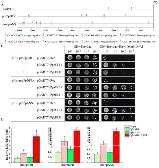 PpMYB1 and PpbHLH1 activate the promoters of PpF3H, PpDFR, and PpANS. (A) Distribution diagram of PpF3H, PpDFR, and PpANS promoter MYB- and bHLH-recognizing elements. pro: promoter. (B) Y1H assay detects the activation of downstream gene promoters by PpMYB1 and PpbHLH1. (C) The dual-luciferase reporter system is used to detect the activation of downstream gene promoters by PpMYB1 and PpbHLH1. The data are means ± SD (n = 3). Letters indicate significant differences (p < 0.05, Duncan’s multiple range tests).