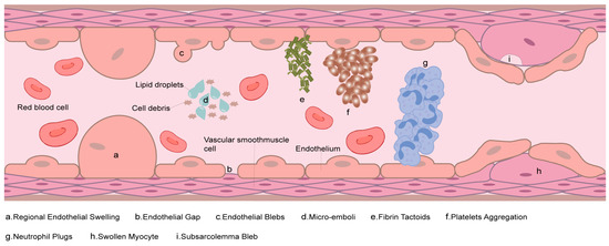 Key pathological changes in microcirculation during IRI. (a) Regional endothelial swelling with cytoplasmic edema and luminal narrowing. (b) Endothelial gap formation due to tight junction degradation, permitting RBC extravasation. (c) Endothelial blebs reflecting membrane protrusions from cytoskeletal disruption. (d) Micro-emboli composed of lipid droplets or apoptotic debris obstructing capillaries. (e) Fibrin tactoids as spindle-shaped fibrin polymers within thrombi. (f) Platelet aggregation with pseudopod extension and microthrombus formation. (g) Neutrophil plugs adhering to activated endothelium. (h) Swollen myocytes compressing adjacent vessels via osmotic edema. (i) Subsarcolemmal blebs beneath the sarcolemma from calpain-mediated cytoskeletal damage.