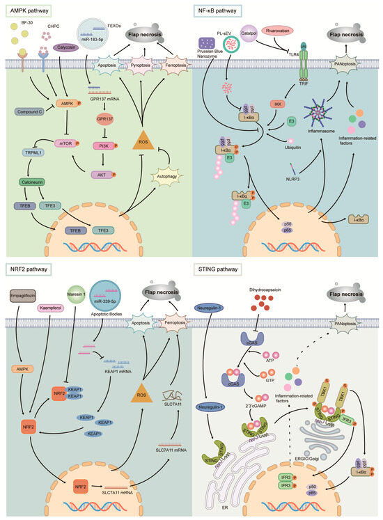 Another critical signaling is the canonical NF-κB signaling pathway, which is primarily activated by inflammatory cytokines (TNF-α, IL-1β), PAMPs, ROS, and various stressors (e.g., UV radiation, DNA damage). Its principal functions involve promoting inflammatory responses, inhibiting apoptosis-related proteins, and participating in immune regulation [70]. Consequently, modulating the NF-κB signaling pathway, such as through the PPAR-γ/NF-κB and TLR4–NF-κB, can effectively suppress the inflammatory response and promote flap survival during ischemia. Pharmaceuticals such as Prussian blue nanozyme (PBzyme), PL-sEVs, catalpol, and rivaroxaban suppress the inflammatory response in ischemic flaps via these pathways, concurrently inhibiting multiple modes of cell death, including apoptosis, pyroptosis, necroptosis, and PANoptosis [30,31,32,33].