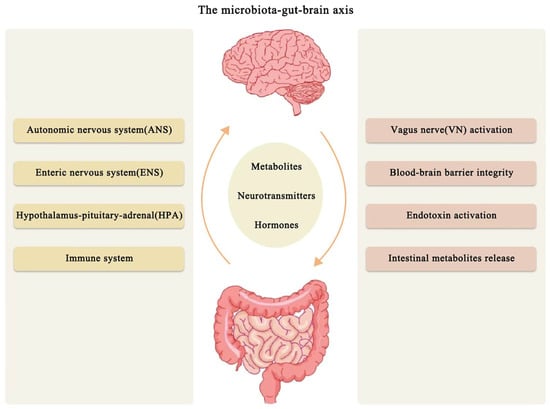 The concept of the MGBA was first introduced by Sudo et al. in 2004 [10], a communication network encompassing the gut, nervous system (central, autonomic, and enteric), HPA (hypothalamic–pituitary–adrenal) axis, the neuroendocrine system, the immune system, gut microbiota, intestinal mucosal barrier, and the BBB [11]. This concept underlies the dynamic bidirectional communications that exist between the CNS and the GIT, functioning through three main pathways: immune, neuronal (including the sympathetic, parasympathetic, and enteric nervous systems), and endocrine (involving the HPA axis) [12]. These pathways facilitate dynamic interactions among gut microbiota, gut metabolism, and the CNS, ultimately influencing brain function (Figure 1). A crucial aspect of this axis is the bidirectional communication system that links the gut microbiota and the brain. The CNS transmits signals to the gut, regulating functions such as peristalsis, mucus secretion, and the mucosal immune system, influencing the diversity of gut bacteria through the ANS (autonomic nervous system). On the other hand, gut bacteria communicate with the CNS and immune system by releasing neurotransmitters, metabolites, and immune mediators, which can either ameliorate or exacerbate brain-related conditions [13,14].