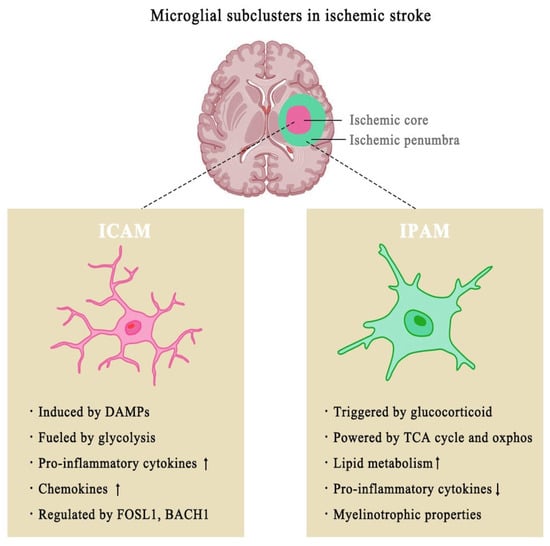 When discussing immune cells within the CNS, microglia inevitably warrant particular emphasis. Microglia—the resident immune cells of the CNS—undergo dynamic functional and phenotypic transformations in response to brain injury [27]. These changes are particularly well-characterized in the Middle Cerebral Artery Occlusion (MCAO) model, which serves as the gold standard experimental paradigm for ischemic stroke research in rodents [28]. This model recapitulates the key pathophysiological features of human stroke through surgical occlusion of the middle cerebral artery (MCA), with both transient (tMCAO) and permanent (pMCAO) variants allowing for an investigation of different ischemic durations. Under homeostatic conditions, microglia perform a variety of essential physiological functions, including regulating neurogenesis and angiogenesis, maintaining BBB integrity, synaptic pruning and remodeling, facilitating synaptic transmission, supporting myelin health, and engaging in the phagocytosis and clearance of apoptotic neurons and debris [29]. Notably, a recent single-cell RNA sequencing study revealed two distinct microglial subclusters that exhibit differential activation patterns under MCAO-induced ischemic conditions [30]. These two subclusters located in different regions of the ischemic brain: ICAM (ischemic core-associated microglia) in the infarcted area and IPAM (ischemic penumbra-associated microglia) in the surrounding penumbra [30]. These subclusters exhibit distinct functional and metabolic profiles, as demonstrated by GSVA (gene set variation analysis) (Figure 2). It was found that ICAM primarily relies on glycolysis, suggesting that they shift towards anaerobic metabolic pathways in response to ischemic injury. IPAM depend on the TCA (tricarboxylic acid) cycle and oxidative phosphorylation, indicative of a more oxidative metabolic profile. This metabolic divergence is linked to their distinct roles in stroke pathology. ICAM are associated with excessive pro-inflammatory responses and enhanced chemotaxis, suggesting they may contribute to tissue damage and exacerbate the acute inflammatory response during ischemic stroke. Their hyperactivation could accelerate neuronal injury and worsen stroke outcomes.
