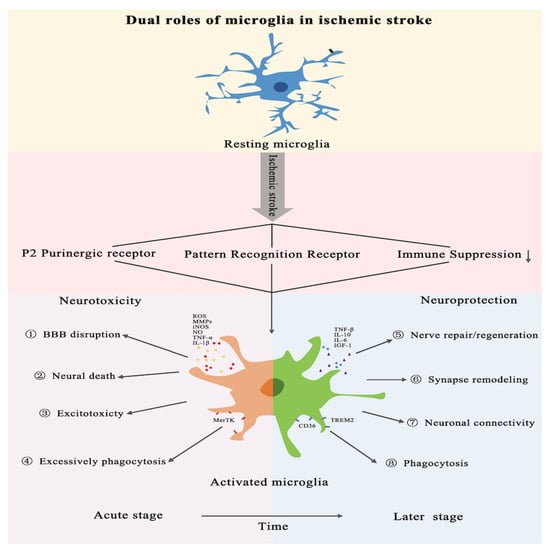Microglial cells exhibit distinct functional states at different stages following ischemic stroke, positioning them as key players with dual roles in neuro-injury and neuroprotection (Figure 3). Early neuroinflammation, driven by microglial activation, serves as an adaptive microglial mechanism, providing neuroprotective effects by facilitating tissue repair, clearing cellular debris, and eliminating pathogens.