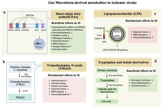 LPS are complex molecules embedded in the outer membrane of the cell wall in Gram-negative bacteria, consisting of three main components: lipid A, the core polysaccharide, and the O antigen. Serving as a protective barrier, LPS defends bacteria against external threats, including antibiotics, antibodies, and the complement system, thereby maintaining the stability and integrity of the cell wall. During the acute phase of an ischemic stroke, gut dysbiosis can lead to an overgrowth of opportunistic pathogenic Gram-negative bacteria, such as Escherichia coli. This can result in increased intestinal permeability, which, in turn, leads to ischemic brain injury via LPS-induced systemic inflammation [66].