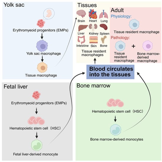 The origin, migration, and development of macrophages is a complex process that shows a high degree of similarity between humans and mice [10]. During embryonic development, the erythroid–myeloid progenitor cells (EMPs) of the yolk sac differentiate in situ into macrophages, and this group of macrophages migrates to the brain tissue to become microglia [11,12]. The EMPs in the yolk sac then migrate to the fetal liver, where they differentiate into hematopoietic stem cells and later differentiate into monocytes, the precursors of macrophages, which are spread through the blood and colonize in the tissues [13]. Hematopoietic stem cells in the bone marrow can also differentiate into monocytes and enter the tissue to differentiate into macrophages. After adulthood, macrophages mainly originate from monocytes in the bone marrow and long-lived macrophages that self-renew in tissues [14] (Figure 1). Macrophages can be classified into several subgroups based on their anatomical locations and functional phenotypes, including microglia in the central nervous system (CNS), osteoclasts in bones, alveolar macrophages in the lungs, histiocytes in the spleen and interstitial connective tissues, Kupffer cells in the liver, etc. [14]. In a disease state, both resident macrophages and bone marrow-derived macrophages may play a role, depending on the location where the disease occurs [15,16,17,18].