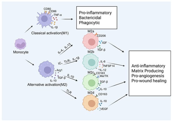 Here, we describe macrophages based on the expression of cell surface markers, the production of specific factors, and their biological activities. These include classically activated or inflammatory macrophages (M1) and selectively activated or anti-inflammatory macrophages (M2), a process known as “macrophage polarization” [19]. (Table 2 describes macrophages with different phenotypes.) M1 macrophages are typically identified by surface markers like CD80 and CD86. These markers activate their oxidase system, leading to the generation of reactive oxygen species [20,21]. Additionally, M1 macrophages secrete a significant amount of pro-inflammatory cytokines such as IL-1β and TNF-α. These macrophages play the function of antigen presentation, participate in pathogen clearance during infection, and play the role of pro-inflammation, the removal of pathogenic microorganisms, and anti-tumor [22]. Correspondingly, M2 macrophages play an anti-inflammatory function, mainly producing anti-inflammatory factors, such as IL-10, TGF-β, and Arg1, to promote tissue repair and wound healing and promote angiogenesis and fibrosis. In general, M2 macrophages can inhibit inflammation; coordinate and promote tissue remodeling, angiogenesis, and immune regulation; and promote the development of tumors [23].