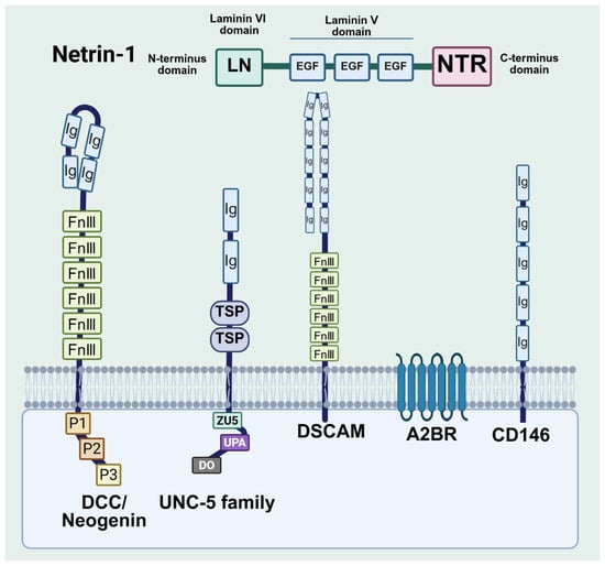 Netrin-1 is a highly conserved, laminin-related molecule encoded by the NTN1 gene located on chromosome 17. It is composed of 604 amino acids and features a highly conserved N-terminal laminin domain (LN, also known as domain VI). Additionally, domain V contains three cysteine-rich LN-type epidermal growth factor (EGF)-like repeats (LE1, LE2, and LE3), along with a small, positively charged C-terminal domain, referred to as the netrin-like (NTR) module [29]. Domains V and VI are crucial for binding to members of the DCC (deleted in colorectal cancer), Neogenin, and UNC5 families [30] (Figure 3). The functional significance of the NTR module in netrin-1 is largely unknown. The NTR domain is not required for secretion [31], nor receptor binding [32,33,34], but changes in the NTR domain affect the binding capacity of a ligand to its receptors and may also be involved in controlling the activity of metalloproteinases [35]. Its structural disruption may even prevent the presence of secreted reticuloprotein-1 in the extracellular space.