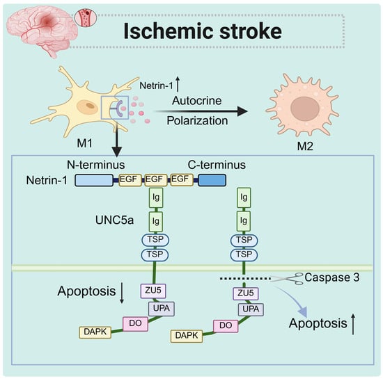 In conclusion, netrin-1 in microglia plays a crucial role in immunity by inhibiting apoptosis and promoting cell survival through its binding with UNC5a. Additionally, microglia that express netrin-1 are more likely to be polarized toward the M2 type, which enhances their anti-inflammatory and repair functions (Figure 4).