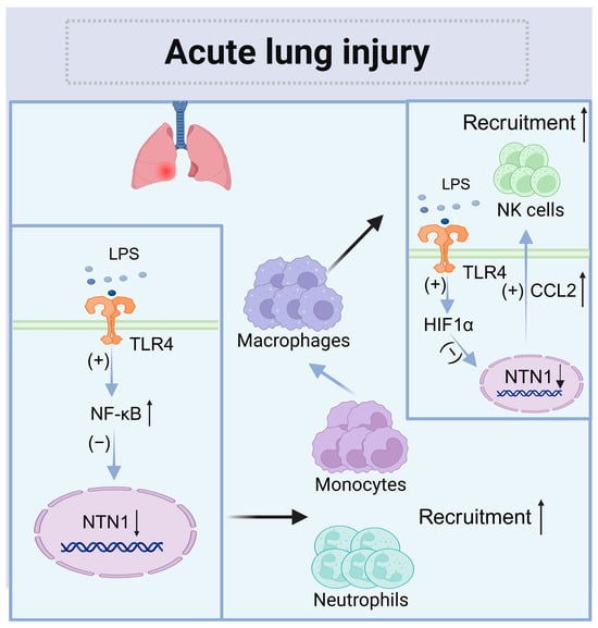 Furthermore, during the early stages of LPS-induced lung injury in mice, the expression of netrin-1 was found to be upregulated in myeloid cells. Myeloid cells, such as macrophages and neutrophils, play a crucial role in innate immunity and are key drivers of both the initiation and resolution of inflammation. Netrin-1 expressed by macrophages can regulate CCL2 secretion, thereby limiting NK cell recruitment [73]. NK infiltration was increased after the depletion of netrin-1 in myeloid cells. Additionally, depleting NK cells in mice has been shown to decrease chemokine-mediated neutrophil recruitment [73]. Furthermore, treating macrophages ex vivo or promoting endogenous overexpression of netrin-1 in vivo can shift macrophages toward an anti-inflammatory M2-like phenotype. This shift limits inflammatory progression and promotes wound healing [74]. Overall, the supplementation of exogenous netrin-1 may represent a promising future therapeutic option (Figure 5).