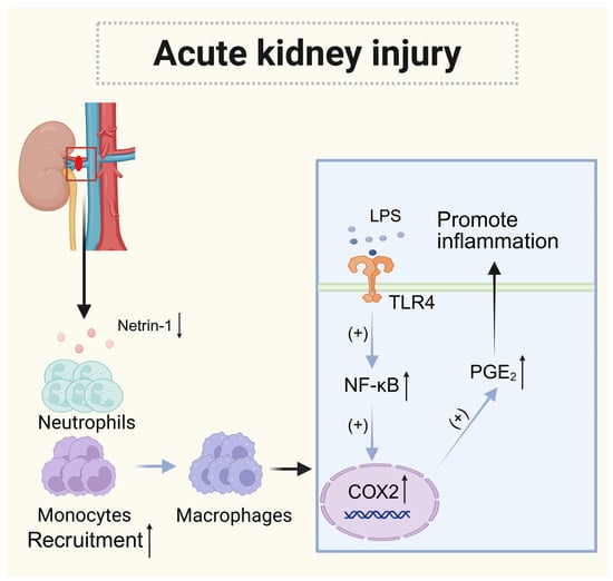 When inflammation occurs, netrin-1 expression is decreased, renal injury and apoptosis are increased, monocyte and neutrophil infiltration are increased, and the production of cytokines (IL-6, IL-1β, and TNF-α) and chemokines is increased [78]. The activation of NF-κB occurs during inflammation; NF-κB is a well-known regulator of the cyclooxygenase pathway. Netrin-1 influences the expression of COX-2 by modulating NF-κB activation. Inhibiting COX-2-mediated production of PGE2 helps to regulate inflammatory responses in neutrophils and macrophages. The infiltration of neutrophils and monocytes is a marker of tissue damage in renal ischemia–reperfusion injury. Increased COX-2 expression results in higher PGE2 production, which subsequently enhances IL-23-mediated migration of neutrophils by increasing IL-17 production [79]. Additionally, netrin-1 binds to UNC5b on neutrophils and monocytes, inhibiting their migration and the release of inflammatory factors. When UNC5b is neutralized, there are increases in monocyte and neutrophil infiltration, along with higher production of serum and renal cytokines and chemokines, ultimately resulting in greater renal injury and tubular cell apoptosis [80].