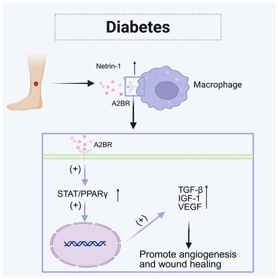 The role of netrin-1 in diabetes. Netrin-1 binds to A2BR on macrophages, activates the STAT/PPARγ signaling pathway, and regulates M2 transformation in macrophages. And through factors such as TGF-β, IGF-1, and VEGF secreted by macrophages, it works synergistically with endothelial cells to promote vascular regeneration and wound healing.