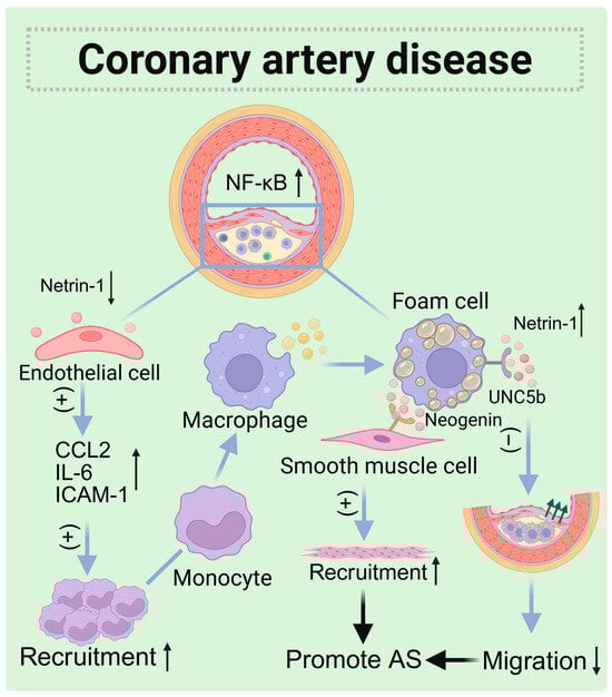 However, in patients with CAD, lipid-phagocytic macrophages exhibit higher levels of intracellular netrin-1, which demonstrates greater accumulation of these macrophages in vivo. Both netrin-1 and UNC5b have been observed in atherosclerotic plaques in mice and humans, particularly within foam cells. Their presence is induced by hypoxia and the accumulation of oxidized low-density lipoprotein (ox-LDL) [98]. Hypoxic stress is closely associated with atherosclerosis and activates inflammatory transcription factors in foam cells [99]. During this process, oxLDL binds to the specific receptor CD36 [100] to activate the transcription factor NF-κB [101,102]. Hypoxia-inducible factors [103], such as HIF1-α and NF-κB, regulate the transcription of netrin-1 and UNC5b [104]. Recombinant netrin-1, as well as netrin-1 secreted by foam cells formed in vitro, can effectively block the directed migration of macrophages to CCL19 [105]. Furthermore, netrin-1 inhibits migration by disrupting Rac1 signaling pathways, reorganizing the actin cytoskeleton, and affecting cell polarization. In the context of atherosclerotic plaques, netrin-1 may serve to anchor foam cells, preventing their migration into the lumen or lymphatic system. Moreover, during atherosclerosis development, netrin-1 binds to Neogenin in the inner and lower smooth muscle cells (SMCs), promoting their migration to the plaques and contributing to the progression of the disease [106,107].