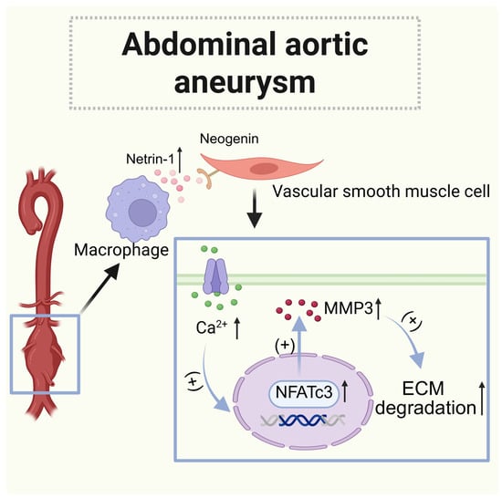 In an abdominal aortic aneurysm (AAA), chronic activity of the extracellular matrix (ECM)-degrading enzyme matrix metalloproteinases (MMPs) has consistently been shown to significantly impair vascular remodeling, often leading to aortic rupture [114]. Specifically, the absence of MMP3 has been found to reduce ECM damage and lower the susceptibility to an AAA in mice. Macrophages are often associated with MMP activity. Macrophage-derived netrin-1 plays a crucial role in regulating the transcription of matrix metalloproteinase-3 (MMP3) and calcium mobilization in neighboring vascular smooth muscle cells (VSMCs) through Neogenin. The activation of Neogenin by netrin-1 is essential for the nuclear translocation of the T-cell transcription factor NFATc3, which enhances the catalytic activity of MMP3. Furthermore, mechanical load on the blood vessel wall is a pathological marker of life-threatening AAAs. VSMCs directly activate the mechanosensory ion channel Piezo1 by up-regulating the cytoskeletal crosslinking agent α-actinin2 in the presence of netrin-1, leading to the formation of a solid-like mechanical state [115]. Piezo1 acts as a mechanical sensor on the cell membrane, which, when activated by mechanical forces, allows ions such as Ca2+ to enter the cell [116,117]. Netrin-1 is released from macrophages that infiltrate the vessel wall and contributes to AAAs by sustaining downstream Ca2+ signaling necessary for stimulating the matrix degradation of MMP3 in VSMCs [112].