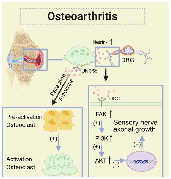 Abnormal remodeling of subchondral bone contributes to the degeneration of articular cartilage [120]. During the early stages of osteoarthritis (OA), the number of osteoclasts increases, leading to preosteoclast-induced angiogenesis [121]. Elevated osteoclast activity stimulates the production of excess transforming growth factor beta 1 (TGF-β1), which recruits bone marrow mesenchymal stem cells, resulting in abnormal subchondral bone formation. The administration of TGF-β1-neutralizing antibodies can help slow the progression of OA by targeting the pathological features of subchondral bone [122]. The osteochondral junction has long been recognized as an early site for the development of new blood vessels. Perivascular sensory and sympathetic nerve fibers can disrupt the integrity of the osteochondral junction [123]. Subchondral bone remodeling initiated by osteoclasts can contribute to OA pain, possibly through the secretion of netrin-1 by osteoclasts. Netrin-1 is found on the membranes of osteoclasts in fluid from OA patients, as well as in mouse models of the temporomandibular joint (TMJ) [124]. Netrin-1 not only acts as a strong stimulant for blood vessel growth but also promotes the proliferation, migration, and adhesion of vascular endothelial cells and smooth muscle cells, playing a significant role in angiogenesis and inflammation [125]. Increased levels of netrin-1 secreted by osteoclasts in OA have been linked to the autocrine and paracrine secretion of UNC5b, which promotes osteoclast differentiation [126]. Netrin-1 enhances this differentiation by binding to its UNC5b. Additionally, netrin-1 interacts with the DCC on sensory neurons. This interaction activates the downstream PI3K/AKT [127] pathway, which induces axonal growth and sensory innervation in the subchondral area [128]. Mice lacking netrin-1 experienced milder OA pain, suggesting that inhibiting netrin-1 or DCC in osteoclasts can alleviate osteoarthritis-related pain [129].