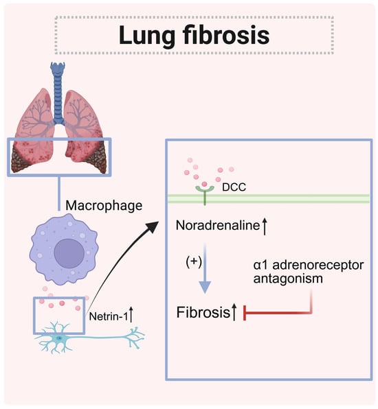 Myofibroblasts and macrophages can create a spatially restricted fibrotic niche [134]. Proteins that guide neurons, such as netrin-1, promote inflammatory scarring. The expression of netrin-1 in IPF is increased. The deletion of netrin-1 derived from macrophages affects collagen accumulation, fibrotic histology, and neuro-related functions in IPF. The IPF lung tissue contains a high concentration of netrin-1+ macrophages and norepinephrine. Netrin-1 produced by macrophages promotes adrenergic neural development and the repair of sensory nerves [135] by interacting with DCC. This interaction reshapes adrenergic nerves and increases the level of norepinephrine required to stimulate fibrosis [136]. Treatment with α1 adrenergic receptor blockers can improve the survival rate.