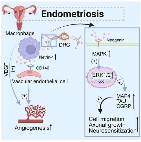 Studies indicate that serum levels of netrin-1 are significantly elevated in endometriosis patients and are positively correlated with pain symptoms [141]. The local accumulation of netrin-1 produced by macrophages promotes the occurrence and development of endometriosis by regulating the proliferation, tubule formation, migration, and invasion of vascular endothelial cells and inducing neuroangiogenesis [141]. The depletion of macrophages led to a reduction in lesion size and blood vessel formation [142]. The amount of vascular endothelial growth factor (VEGF) produced by peritoneal macrophages increases in women with endometriosis. The netrin-1 receptor CD146 is a high-affinity receptor that can activate endothelial cells and initiate downstream VEGF signaling pathways [143]. In the endometriosis microenvironment, the expression of this receptor is significantly increased in vascular endothelial cells. Additionally, Neogenin, another receptor, is overexpressed in sensory neurons that infiltrate endometriosis tissue. The combination of netrin-1 and Neogenin activates the MAPK signaling pathway, leading to an upregulation of MAP4, TAU, and CGRP, which promotes myoduct formation and supports neuronal regeneration [144]. Netrin-1 also enhances the growth and migration of Schwann cells through its interaction with DCC [145] and UNC5b [146], thereby facilitating the regeneration of peripheral nerves.