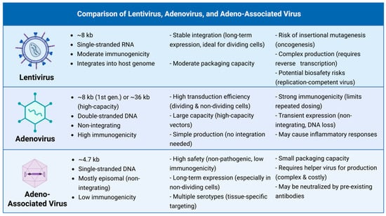 Comparison of Lentivirus, Adenovirus, and Adeno-Associated Virus. Created with BioRender (http://app.biorender.com), accessed on 22 April 2025.