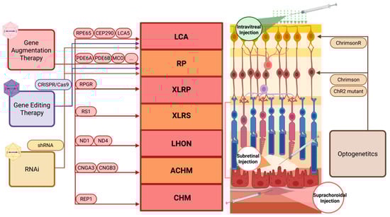Application of AAV-mediated gene therapy in hereditary retinal diseases. Created with BioRender (http://app.biorender.com), accessed on 22 April 2025. Color-coded arrows indicate: Red arrows: Gene augmentation therapy; Purple arrows: Gene editing therapy; Yellow arrows: RNA interference (RNAi) therapy; Brown arrows: Optogenetic therapy.
