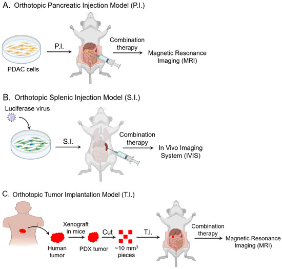 Workflows of the orthotopic mouse models used in this study. (A) In the pancreatic injection (P.I.) model, PDAC cells were orthotopically injected into the pancreas of nude mice, and tumor growth was monitored by MRI. (B) In the splenic injection (S.I.) model, luciferase-transduced PDAC cells were injected into the spleens of nude mice, and metastatic tumor burden was monitored using IVIS bioluminescence. (C) In the human PDAC tumor implantation (T.I.) model, ~10 mm3 pieces of human PDX tumor were surgically implanted into the pancreas of nude mice, and tumor growth was monitored by MRI. Cell culture and mouse templates were taken from the Biorender.com.