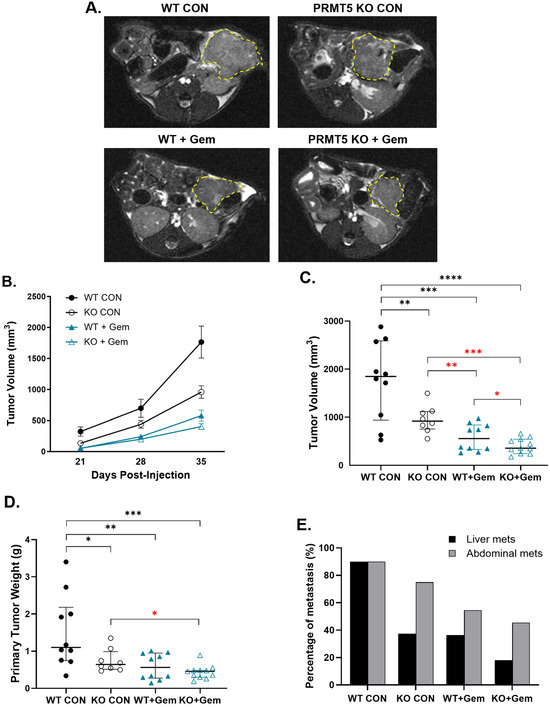 Effect of PRMT5 depletion on pancreatic tumor growth and metastasis in an orthotopic P.I. model. In total, 1 × 106 WT or PRMT5 KO mPanc96 cells were injected into the pancreas of nude mice and subsequently treated with Gem. Tumor growth was monitored by MRI. Representative axial MRI images at 35 days post-injection of control (CON) and Gem-treated WT and PRMT5 KO tumors are shown, with the tumor cross-sectional area outlined (A). Average (mean +/− SEM) tumor volume as measured by MRI over time (B). The median and interquartile range for tumor volume (C), tumor weight (D), and metastatic tumor percentage (E) were assessed at the end of the experiment (35 days post-injection). n = 10 mice per group; Kruskal–Wallis test was used to analyze nonparametric or mixed data, * p < 0.05, ** p < 0.01, *** p < 0.001, **** p < 0.0001; Student’s t-tests were used to assess the differences between two groups with a specific directional hypothesis (red asterisk), * p < 0.05, ** p < 0.01, *** p < 0.001.