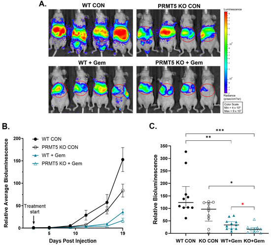Effect of PRMT5 depletion on splenic tumor metastasis in an S.I. model of liver metastasis. In total, 2 × 106 WT or PRMT5 KO mPanc96 cells with luciferase virus infection were injected into the pancreas and subsequently treated with Gem. Tumor growth was monitored by bioluminescence. Representative bioluminescence images at the experiment endpoint (19 days post-injection) are shown, where red indicates maximum bioluminescence, blue indicates minimal bioluminescence, and the red line indicates the region of interest used in the analysis (A). Average (mean +/− SEM) bioluminescence, relative to post-injection day 2, over time (B). Relative bioluminescence (median with interquartile range) at end of experiment, 19 days post-injection (C). n = 10 mice per group; Kruskal–Wallis test was used to analyze nonparametric or mixed data, * p < 0.05, ** p < 0.01, *** p < 0.001; Student’s t-tests were used to assess the differences between two groups with a specific directional hypothesis (red asterisk), * p < 0.05.