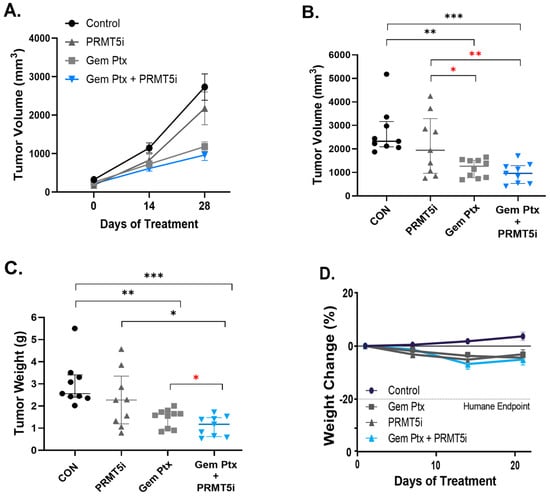 Effect of PRMT5 pharmacologic inhibition on pancreatic tumor growth in orthotopic T.I. model. Pieces of human PDX tumor measuring ~10 mm3 were surgically implanted into the pancreas of nude mice, and tumor growth was monitored by MRI. The mice were treated with a PRMT5 inhibitor [PRMT5i] or/and Gem and Ptx as indicated, and the average (mean +/− SEM) bioluminescence, relative to post-injection day 2, was measured over time (A). The median and interquartile range for tumor volume (B) and tumor weight (C) were assessed at the end of the experiment (28 days of treatment). The mouse weight change over the course of the treatment in each treatment group (D). n = 10 mice per group; Kruskal–Wallis test was used to analyze nonparametric or mixed data, * p < 0.05, ** p < 0.01, *** p < 0.001; Student’s t-tests were used to assess the differences between two groups with a specific directional hypothesis (red asterisk), * p < 0.05, ** p < 0.01.