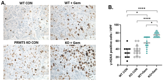 We then aimed to understand the mechanism behind the combination therapy and assess the therapeutic value of this combination in vivo. Counting the γ-H2AX-positive cells per HPF allows for a quantitative assessment of the level of DNA damage within the tumor [35]. A higher number of γ-H2AX-positive cells per HPF typically indicates increased DNA damage, potentially linked to treatment response. IHC of the tumors obtained at necropsy demonstrated a significant increase in the expression of γ-H2AX, a marker of DNA damage in the form of DNA double-strand breaks, in the treatment of PRMT5 KO cells with Gem (Figure 5). These results suggest that PRMT5 depletion significantly induces DNA damage in combination therapy with chemotherapeutics.