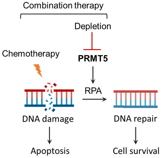Figure 6 provides a schematic representation of the synergistic effects of PRMT5 inhibition with chemotherapy, highlighting a potential combination therapy for PDAC. PRMT5 activates RPA2-mediated DNA repair pathways in chemo-treated cells [8]. The depletion or inhibition of PRMT5 synergistically induces apoptosis through blocking the RPA-mediated DNA repair pathway in response to chemotherapy.