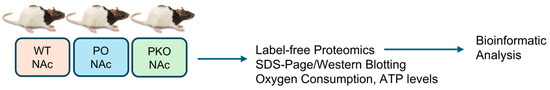 All experiments and procedures were approved by the Wayne State University Institutional Animal Care and Use Committee (protocol # 22-09-4982) and conducted in compliance with all standards for animal care and investigation established in the Guide for the Care and Use of Laboratory Animals (National Research Council 2011) and the Federal Animal Welfare Act. The study employed N = 36 adult male Long Evans rats: WT, PKO (Park2−/−), and PO (~67 days old at the beginning of the experiment) acquired from Inotiv (previously Envigo, Indianapolis, IN, USA) and Charles River Laboratories (Willington, MA, USA). The PO rats were generated in our laboratory by bilaterally overexpressing parkin in the NAc, as described below. All rats were allowed to acclimate for one week after delivery. The rats were housed in a temperature- and humidity-controlled room under a 12:12 h light/dark cycle (temperature: ~21 °C; humidity 40–70%). The rats were sacrificed by decapitation one month after their arrival. NAc tissue was dissected and subjected to several analyses (Figure 1). Three rats per group were used for the proteomic analysis, n = 4 per group for measurement of mitochondrial function, and n = 7 per group were employed in SDS-PAGE and western blotting. Parkin knockout and parkin overexpression were validated by SDS-PAGE and western blotting).