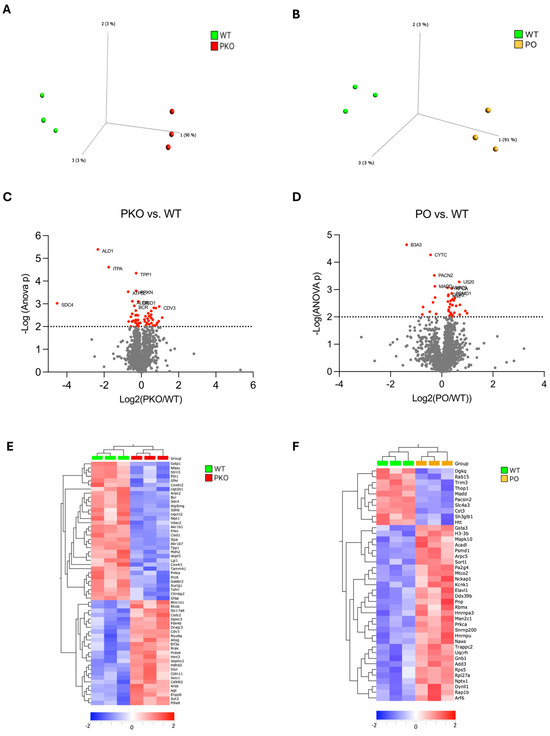 Differentially Expressed Proteins in Parkin-Deficient and Parkin-Overexpressing Rat Nucleus Accumbens. (A,B) Principal component analysis (PCA) of proteomic data derived from parkin-deficient (PKO), parkin-overexpressing (PO), and wild-type (WT) rat nucleus accumbens (n = 3/group). Each mark represents an individual rat. Note that the PKO and PO groups are clearly separate from the WT group. (C,D) Volcano plots showing relationships between the magnitude of change in protein expression (log2 of fold change; x-axis) and statistical significance of this change (−log10(p); y-axis] in a comparison of PKO to WT and PO to WT. Colored points represent differentially expressed proteins (DEPs) at a cutoff p = 0.01. (E,F) Heatmaps depicting DEPs upregulated (red) and downregulated (blue) in rat nucleus accumbens by parkin knockout (PKO) or overexpression (PO) relative to wild-type (WT) nucleus accumbens (p < 0.01, Qlucore Explorer).