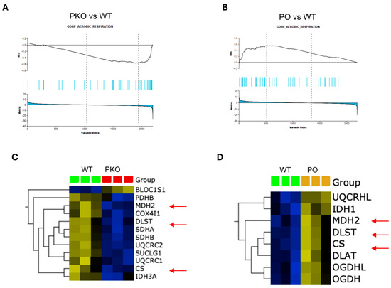 As aforementioned, GSEA calculates an enrichment score (ES) that reflects the degree to which a gene or protein set is overrepresented at the extremes (top or bottom) of an entire ranked list of genes or proteins that differ between two phenotypes. The GSEA also identifies a subset of genes/proteins (leading-edge subsets) that impact the ES most. Figure 3 shows that proteins from the aerobic respiration signature are overrepresented at the top or bottom in PKO NAc and PO NAc, respectively, relative to WT NAc (Figure 3A,B). The hierarchical clustering heatmaps show the leading-edge proteins from the aerobic respiration signature (Figure 3C,D). Proteins significantly overrepresented (p < 0.05) in the aerobic respiration signature in PKO NAc included subunit beta of mitochondrial pyruvate dehydrogenase E1 (PDHB), a protein that links glycolytic pathway to the Krebs cycle, six Krebs cycle proteins (subunit α of succinyl-CoA synthetase (SUCLG1), subunit α of mitochondrial isocitrate dehydrogenase [NAD], (IDH3A), citrate synthase (CISI), mitochondrial malate dehydrogenase (MDH2), and dihydrolipoyllysine-residue succinyltransferase component of 2-oxoglutarate dehydrogenase complex (DLST), six electron transport chain (ETC) proteins: subiquinol-cytochrome C reductase core protein 2 (UQCRC2), cytochrome c oxidase subunit 4 isoform 1 (COX4I1), succinate dehydrogenase complex iron sulfur subunit B (SDHB), succinate dehydrogenase complex iron-sulfur subunit A (SDHA), ubiquinol-cytochrome C reductase complex III subunit VII (UQCRQ), ubiquinol-cytochrome C reductase core protein 1 (UQCRC1), and biogenesis of lysosome-related organelles complex 1 subunit 1, a component of the BLOC-1 complex that may negatively regulate aerobic respiration (UNIPROT). Proteins significantly overrepresented (p < 0.05) in the aerobic respiration signature in PO NAc included five Krebs cycle enzymes, CS, MDH2, DLST, 2-oxoglutarate dehydrogenase complex component E1 (OGDH), and 2-oxoglutarate dehydrogenase-like component (OGDHL) of the complex as well as cytochrome b-c1 complex subunit 6-like (UQCRHL) belonging to the ETC, and cytoplasmic isocitrate dehydrogenase [NADH] (IDH1). Among aerobic respiration DEPs, three Krebs cycle proteins were significantly altered in abundance in opposite directions in PKO and PO rats: CS, MDH2, and DLST (Figure 3C,D, arrows).