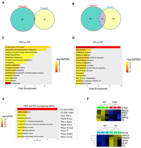 We next examined which of the other DEPs from the PKO and PO rats were changed in opposite directions. There was no overlap between 58 and 41 DEP sets at p < 0.01 (Figure 4A). At the p threshold of 0.05, there were 196 DEPs unique to the PKOs, 145 DEPs unique to the POs, and 32 shared DEPs (see Supplementary Tables S1 and S2 for the complete lists of the DEPs). (Figure 4B), with 11 DEPs changed in opposite directions (Table S7). Subsequently, we examined the pathways to which the DEPs from both groups (POs: 228 DEPs and PKO: 177 DEPS, including shared DEPs) belong, using the ShinyGo software and the KEGG knowledge base (q < 0.05 and a minimum of two genes/proteins per pathway). In PKO rats, the top 20 enriched pathways included multiple metabolic pathways and neurodegeneration pathways, with the most enriched pathway being the Krebs cycle (citric cycle, TCA cycle) (Figure 4C). The top 20 pathways altered by parkin overexpression in the NAc also included the Krebs cycle, carbon metabolism pathways, and pathways known to be involved in addiction, such as GABA, glutamate, and dopamine neurotransmission and regulation of actin cytoskeleton (Figure 4D). At the settings of q < 0.05 and a minimum of two genes per pathway, the shared DEPs belonged to 10 pathways (Krebs cycle, carbon metabolism, gap junction, morphine addiction, glutamatergic synapse, HIF-1 signaling, Fc γ R mediated phagocytosis (this process involves actin cytoskeleton), neutrophil extracellular trap formation, spinocerebellar ataxia, and parathyroid hormone synthesis secretion and action), with PRKCA and three enzymes belonging the Krebs cycle, CS, MDH2 and DLST, being the most common DEPs in these pathways (Figure 4E). To confirm the data, we ran a comparison of PKO DEPs with PO DEPs on GSEA and found CS, MDH2, DLST, PRKCA, and ARPC5 significantly changed in opposite directions in the PKO and PO NAc (p < 0.05, q < 0.05) (Figure 4F). Thus, both types of analyses, GSEA and ShinyGO, provided the same results regarding pathways and proteins significantly altered by lack or excess of parkin.