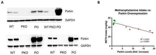 Adeno-Associated, Virus-Mediated Overexpression of Parkin in Rat Nucleus Accumbens Is Variable and Negatively Correlates with Methamphetamine Self-Administration. (A) Assessment of parkin levels in wild-type, parkin knockout (PKO), and parkin-overexpressing nucleus accumbens (n = 7) by SDS-PAGE and western blotting, with GAPDH as a loading control. The top panel shows the results from samples analyzed by proteomics, whereas the bottom panel shows the results from additional samples. Variability in parkin overexpression should be noted. (B) In our previous study, parkin overexpression negatively correlated with METH intake in the drug self-administration paradigm [4]. Green dots represent parkin levels in wild-type nucleus accumbens, whereas the red dots represent parkin levels in parkin-overexpressing nucleus accumbens.