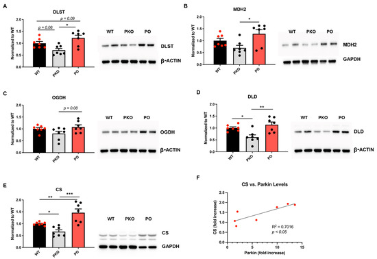 The SDS-PAGE/western blotting analysis confirmed that DLST, MDH2, and CS levels decreased in the PKO NAc and increased in PO NAc (Figure 6A–C). The same trend was observed for the other two enzymes that, together with DLST, belong to the oxoglutarate dehydrogenase complex: DLD and OGDH (Figure 6D,E). The levels of CS significantly correlated with parkin levels (Figure 6F). Assessment of the levels of electron transport chain enzymes in PKO and PO rats versus their WT counterparts did not detect significant changes, except for an increase in complex IV in PO vs. PKO NAc (Supplementary Figure S2).
