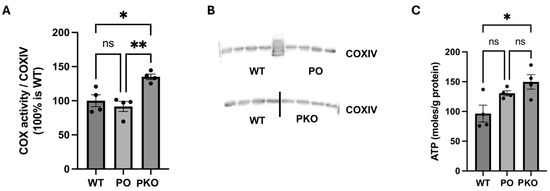 The analysis of oxygen consumption was conducted in the presence of 20 mM ascorbate and 30 µM cytochrome c (Sigma-Aldrich, Saint Louis, MO, USA, cat # C3131). Continuous monitoring of oxygen consumption rates allowed for data collection in nmol/min/mg of total protein, which was subsequently analyzed using OxyTrace+ software (version 1.0 Build 48, 2016, Hansatech Instruments Ltd., Amesbury, MA, USA) [34,35]. It should be noted that this protocol avoids the use of compounds such as N,N,N′,N′-tetramethyl-para-phenylene-diamine (TMPD) and the detergent dodecyl maltoside (DDM) because they render the complex IV kinetics unphysiological as extensively discussed [36,37]. ATP levels were assessed using the boiling method on flash-frozen tissue samples with the ATP bioluminescence assay kit HS II (Roche Applied Science, Penzberg, Germany), and data were standardized based on protein concentration and normalized to the WT group as described previously [34,35].