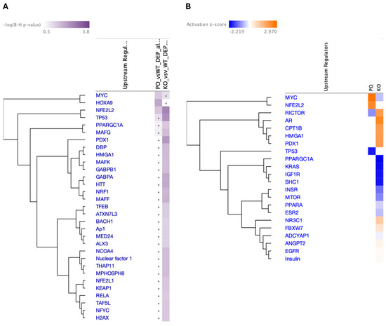 The predicted top three upstream transcriptional regulators in PKO NAc identified by the IPA as significantly changed (p < 0.05) were nuclear factor-2 (NRF2 or NFE2L2), TP53, and PDX1 (Figure 8A). Other significant transcription factors included those regulating energy metabolism, differentiation, and gene expression (Benjamini–Hochberg [B-H] p <0.05), including THAP11 (Ronin), a transcription factor regulating the expression of genes required for mitochondrial function, including parkin and genes coding for the components of the ETC. Only three transcriptional regulators were identified as significant (B-H p <0.05) in PO NAc: HOXA9, MYC, and NRF2. MYC was upregulated in PO NAc and downregulated in PKO NAc (Figure 8B). TP53 and PDX1 were identified as highly significant in PKO rats, while MYC and HOXA9 were identified as highly significant in PO rats.