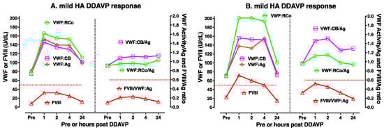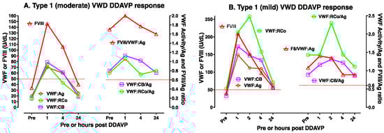 Two case examples of DDAVP use in type 1 VWD for a moderately (A) and for a mildly (B) affected patient. Different patients will yield different test patterns or responses to DDAVP, highlighting the need for DDAVP trials such as shown here to establish responsiveness in any individual patient. In both these examples, FVIII and VWF levels have all been raised to above 50 U/dL for both patients post-DDAVP but were maintained above 50 U/dL only for the mildly affected patient. In both patients, the ratio of FVIII to VWF:Ag (FVIII/VWF:Ag) and VWF activity/VWF:Ag ratios were normal (>0.6) at all time points (i.e., pre- and post-DDAVP).