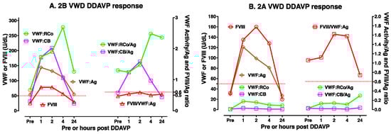 An example of DDAVP use in type 2B VWD (A) and type 2A VWD (B). Different patients will yield different test patterns or responses to DDAVP, highlighting the need for DDAVP trials such as shown here to establish responsiveness in any individual patient. DDAVP use in type 2B VWD is usually considered contra-indicated but may be useful in select patients (notably those without thrombocytopenia). In the type 2B patient shown (A), DDAVP use raised all VWF parameters and FVIII to above 50 U/dL for 4 h, and VWF activity/Ag ratios normalized (i.e., >0.6) and did not lead to thrombocytopenia. In this type 2B VWD patient, however, assessed FVIII levels were unusually low. For the 2A VWD patient, VWF:Ag and FVIII levels both increased above 50 U/dL for 4 h, but VWF activity levels did not, and all VWF activity/Ag ratios were <0.6 at all time points. Thus, this 2A VWD patient was DDAVP responsive for FVIII but not for VWF activity. In summary, DDAVP use showed only partial clinical utility for these patients.