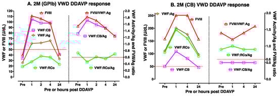 Examples of DDAVP use in type 2M VWD. Different patients will yield different test patterns or responses to DDAVP, highlighting the need for DDAVP trials such as shown here to establish responsiveness in any individual patient. (A) DDAVP use in type 2M VWD expressing a glycoprotein Ib (GPIb) binding defect manifesting as relatively reduced VWF:RCo activity. In this patient, FVIII, VWF:Ag, and VWF:CB all normalized to >50 U/dL for at least 4 h, but VWF:RCo did not. Also, the ratio of FVIII to VWF:Ag (FVIII/VWF:Ag) and the VWF:CB/Ag ratios remained normal (>0.6) at all time points, whilst the VWF:RCo/Ag ratio did not. (B) DDAVP use in type 2M VWD expressed a collagen binding (CB) defect manifesting as relatively reduced VWF:CB activity. In this patient, FVIII, VWF:Ag, and VWF:RCo remained normal (i.e., >50 U/dL) at all time points, but VWF:CB did not. Also, the ratio of FVIII to VWF:Ag (FVIII/VWF:Ag) and the VWF:RCo/Ag ratios remained normal (>0.6) at all time points, whilst VWF:CB/Ag ratio did not. In summary, DDAVP use showed only partial clinical utility for both patients but also aided in confirming their respective phenotypes as 2M VWD of a GPIb type (A) or of a CB type (B).