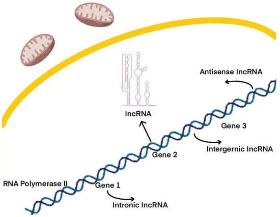 LncRNAs lack protein-coding potential and constitute a major portion of the human transcriptome []. These RNAs represent nearly 98% of the RNA transcribed from the human genome, which is non-coding. Interestingly, a significant portion—nearly three-quarters—of the genes within the less than 2% of the human genome that do encode proteins are actively transcribed into non-coding RNAs [,]. The origins of lncRNAs are varied; they can emerge from enhancer regions, independent promoters, or share promoters with both coding and non-coding genes []. This genomic diversity contributes to the wide range of functional and regulatory roles that lncRNAs play []. Consequently, lncRNAs are classified into eight distinct categories based on their genomic origins: intergenic lncRNAs, intronic lncRNAs, enhancer lncRNAs, promoter lncRNAs, natural antisense/sense lncRNAs, small nucleolar RNA-derived lncRNAs (sno-lncRNAs), bidirectional lncRNAs, and non-polyadenylated lncRNAs [,,] (Figure 1). Each type plays a unique role in cellular functions and is essential for biological processes. Across mammals, all lncRNAs exhibit common structural, functional, or mechanistic characteristics, including transcription by RNA polymerase II, which is associated with a 5′ cap structure and, optionally, a 3′ polyA tail [,,]. In addition, lncRNAs play a pivotal role in regulating various biological processes, such as gene expression, alternative splicing, chromatin modification, the modulation of protein activity, and post-transcriptional mechanisms []. These processes enable lncRNAs to directly or indirectly influence the onset and progression of cancer.