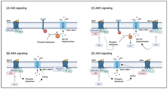 - Ferkey, D.M.; Sengupta, P.; Noelle, D.L. Chemosensory signal transduction in Caenorhabditis elegans. Genetics 2021, 217, iyab004. [Google Scholar] [CrossRef]