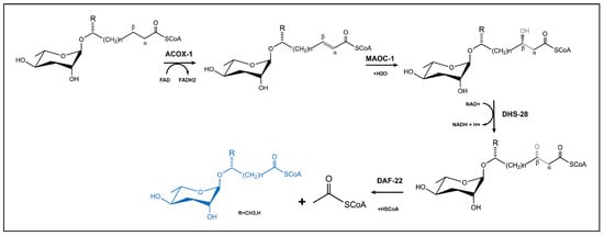 - Zhang, X.; Wang, Y.; Perez, D.H.; Jones Lipinski, R.A.; Butcher, R.A.; Lipinski, R. Acyl-CoA Oxidases Fine-Tune the Production of Ascaroside Pheromones with Specific Side Chain Lengths. ACS Chem. Biol. 2018, 13, 1048–1056. [Google Scholar] [CrossRef]