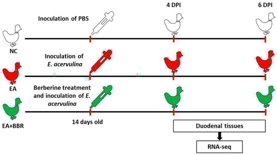 Schematic diagram of experiment design. Duodenal tissues were collected in berberine-treated and E. acervulina (EA)-infected broilers. Two-week-old ROSS 308 female chickens were orally infected with 1 × 105 sporulated oocysts of EA. NC, uninfected control; EA, E. acervulina infection; EA+BBR, berberine treatment and inoculation of E. acervulina; DPI, days post-infection.