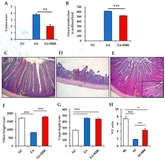 At 6 dpi, the lesion score was significantly reduced in the berberine-treated and infected (EA+BBR) group (3.8 ± 0.18) compared to the untreated and infected (EA) group (2.0 ± 0.28) (Figure 2A). There was a significant difference in fecal oocyst production between the EA (6.1 × 108 ± 5.5 × 106) and EA+BBR groups (5.2 × 108 ± 7.1 × 106) (Figure 2B). The untreated and uninfected control (NC) group showed no lesion score and fecal oocyst shedding. Bodyweight gain was significantly decreased in the EA+BBR group compared to the NC and EA groups, but no difference was observed between the NC and EA groups (Figure S1). In the histopathological analysis (Figure 2C–H), berberine treatment showed an increase in villus height (VH) without an effect on crypt depth (CD) (Figure 2C–E). A significant reduction in VH was observed in the EA group, but this was compensated for by berberine treatment. The VH was reduced by approximately 51.5% (829 ± 25.9 μm, p < 0.001) in the EA group and increased by 1.0% (1791 ± 74.8 μm) in the EA+BBR group, respectively, compared to the NC group (1709 ± 44.1 μm) (Figure 2F). The CD increased by approximately 75.8% (459 ± 17.2 μm, p < 0.001) in the EA group and 70.1% (446 ± 29.0 μm, p < 0.001) in the EA+BBR group, respectively, compared to the NC group (261 ± 16.3 μm) (Figure 2G). Compared to the VH to CD ratio in the NC group (7.4 ± 0.6), there was a significant decrease from 75.5% to 41.9% in the EA group (1.8 ± 0.05, p < 0.001) and the EA+BBR group (4.3 ± 0.4, p < 0.05), indicating that berberine treatment increased the VH and the VH to CD ratio compared to the EA group infected with E. acervulina alone.