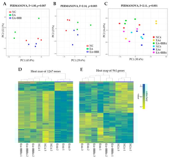 Transcriptomic data analysis of differentially expressed genes. (A–C) Plots of principal component analyses were based on expression level clustering of samples. p-value derived from the PERMANOVA test with 999 permutations. (D,E) Heatmap for hierarchical clustering between samples through clustering of the DEGs. Plots (A,D) are samples from day 4 post-infection. Plots (B,E) are samples from day 6 post-infection, and plot (C) includes both samples from days 4 and 6 post-infection. NC, uninfected control; EA, E. acervulina; BBR, berberine; PERMANOVA, permutational multivariate analysis of variance; DEGs, differentially expressed genes.